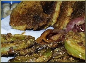 Dip the tomato slices into the egg and milk, then coat with the dry mixture. |