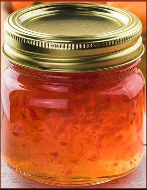 Bring peppers and vinegar to a boil, add 5 cups sugar, and