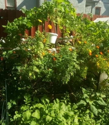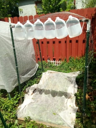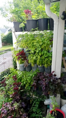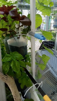 ![]() Cut half of the top out of a plastic jug, leaving the handle. I prefer vinegar jugs, as they are sturdier than water jugs. Remember to drill some drain holes in the bottom! | ![]() Slide jugs onto a pole or old mop handle, and secure to a reasonably sturdy wall or fence, and fill with soil. I find herbs grow best in this arrangement. | ![]() Can be used to make a lovely little green space where little space is available! |