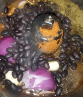 ![]() Black Beans, 1/2 cup | ![]() Beans to blender | X | ![]() 1 cup liquid to pot |