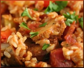 Combine the skillet mixture with the hot cooked rice and sausage pieces in a large serving bowl and toss together thoroughly.