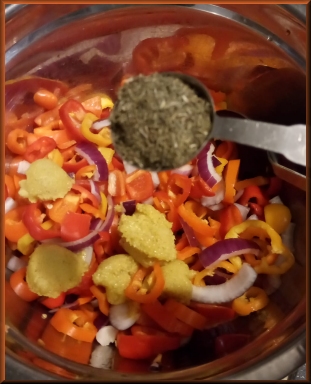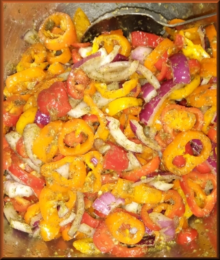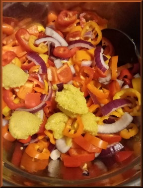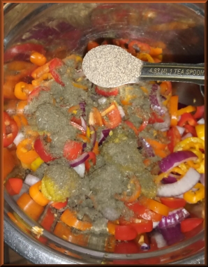![]() 2 lb sliced bell peppers 1 roughly chopped red onion 6 tablespoons garlic paste |
