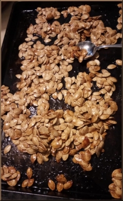 Pour over and coat seeds from 2 large pumpkins, or 11 x 13 baking sheet (approx 2 cups).