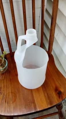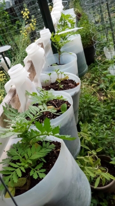![]() Cut half of the top out of a plastic jug, leaving the handle. I prefer vinegar jugs, as they are sturdier than water jugs. Remember to drill some drain holes in the bottom! | ![]() Slide jugs onto a pole or old mop handle, and secure to a reasonably sturdy wall or fence, and fill with soil. I find herbs grow best in this arrangement. | ![]() Can be used to make a lovely little green space where little space is available! |