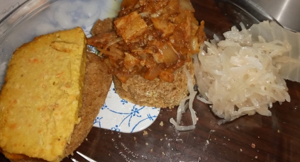 ![]() Cheddar, with jackfruit pulled not-pork and Bubbies sauerkraut, whole wheat roll. |