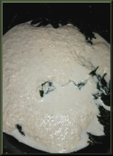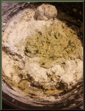 Place the flour for dusting on a plate and drop a spoonful of the spinach dumpling batter on the flour.