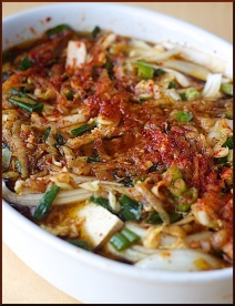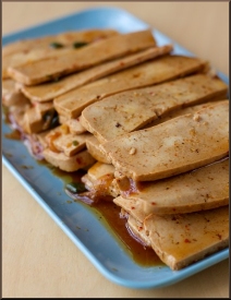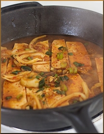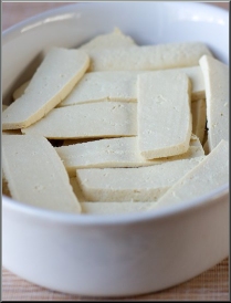 Slice and cover the tofu slices with your chopped onions, green onions, ginger and garlic.