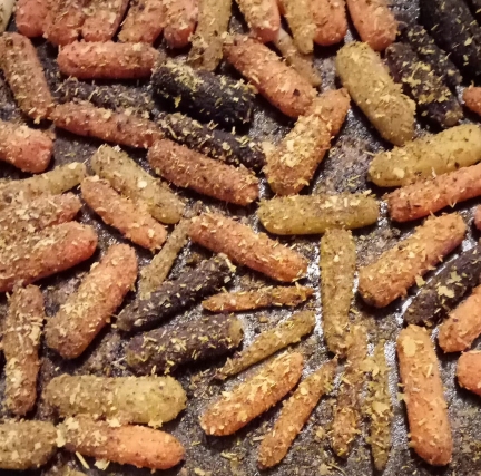 Baby carrots coated in olive oil, bragg nutritional yeast, and bragg seasoning mix